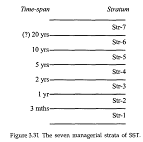Jaques main findings is described in Figure 3.31. It points to the existence of a substructure composed of seven managerial strata with consistent boundaries measured in time-spans according to the figure. Such a general depth-structure of bureacratic stratification is universally applicable and can be used in the design of different organizations.