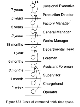 Figure 3.32 shows a series of lines of command in which timespans have been measured for each role. As one moves higher up in the hierarchy there is a funning out of the time-spans, a phenomenon occuring universally. The arrows from each role denote the occupant’s feeling of where his real manager is situated as against his manifest manager. The time-span will give the stratum in which a certain role should be placed. If the time span is 18 months, a stratum 3 role should be applicable. Time-spans below 3 months are assigned in concrete terms and are carried out in direct physical contact with the output.
