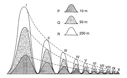 They represent the amount of the population capable of working at succesive work-strata. Population P provides succession up to stratum 6, Q up to stratum 7, and R up to 8. The letters represent Holland, England and the US. An analysis of the three countries show that Holland can sustain a fair number of stratum 6 bureaucracies, but too little in higher strata. England can sustain enough for stratum 7. The US, by contrast, is able to sustain a number of super-corporations on a national basis with stratum 8 bureaucracies. In fact, most of them have become multinationals — a result of having a population of more than 250 million people.