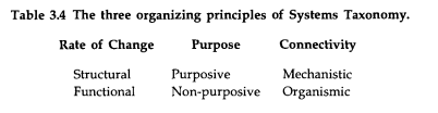 Systems taxonomy has three basic organizing principles which enable an observer to define a system as an ‘interaction between what is out there and how we organize it in here’: rate of change, purpose and connectivity. Each principle defines two antitheses of the other, thereby giving three pairs of properties.
