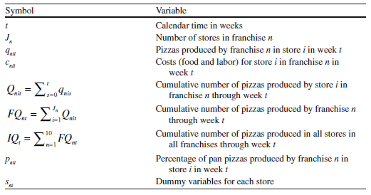 The franchise data have many attractive properties. The inputs to the production function (i.e., the raw materials) are homogeneous. Therefore, input characteristics are controlled for naturally in the sample. Differences in technology across pizza stores are very small. Thus, factors that may be hard to control for statistically in production environments are controlled for naturally in the sample. The symbols used and the variables they represent are listed in Table 6.1.