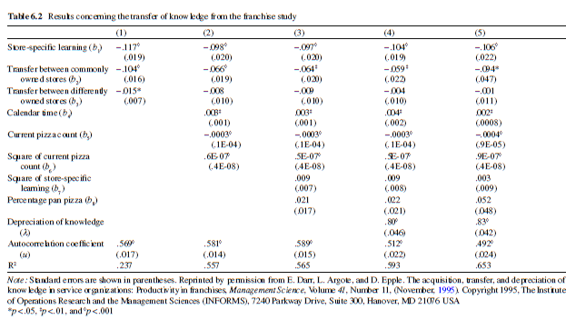 An issue that arose in the franchise study that may confront other researchers who study learning in multiple organizations is the absence of data from the start of operation at all of the organizations. In particular, we did not have data from the start of production for half the stores. These stores were in operation several years before the data collection began. We dealt with this limitation by treating pizza production prior to the beginning of the data collection as an unknown coefficient in the model (see Column 5 of Table 6.2) and estimating it along with the other coefficients. As will be seen shortly, the results from estimating that model were virtually the same as from the other models.