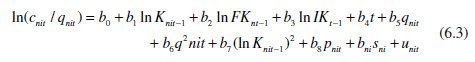 Comparing column 1 and column 2 of Table 6.2 reveals that the impact of transfer between differently owned stores was no longer significant, whereas the effects of store-specific experience and transfer between commonly owned stores on the unit cost of production were unchanged with the addition of calendar time, current pizza count, and the square of current count. This illustrates the importance of controlling for scale economies because other variables can pick up their effects if scale vari- ables are excluded.