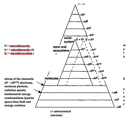 The theoretical hierarchical organization of nature with the microhierarchy superimposed on the macrohierarchy is shown in Figure 3.17. The intersection between the two hierarchies is on the level of the atom. This integrated hierarchy with its different levels is called the Natural Systems by Laszlo.
