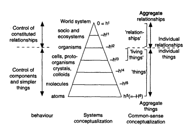 When examining the natural systems we find that they consist of both things and relationships. In Figure 3.19, the concept of things and relationships is related to the levels of microhierarchy. Things below but close to the human level are easy to grasp mentally; above this level the concept of things tends to transcend into relationships. On much lower levels of the hierarchy things are known only as an aggregate of smaller entities, such as crystals made up of molecules. Relationships become gradually weaker as we rise above the human level. From a personal point of view, the relationship vis-à-vis humanity is naturally more diffuse than one with a neighbour.