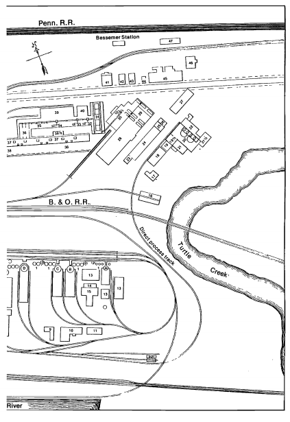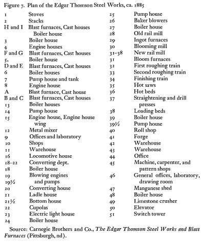 The works relied at first on Carnegie’s nearby Lucy and Isabella blast furnaces for their pig iron. Then in 1879 large blast furnaces were built at the plant site. The design of the works (figure 7) permitted the E. T. Works, as they were always called, to become the most efficient steel producer in the nation, and indeed the world.