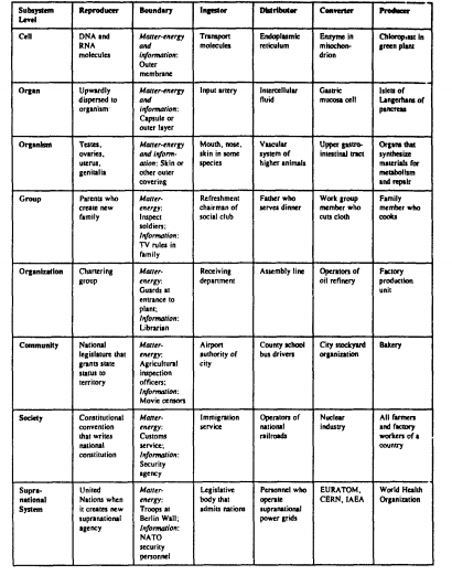 Figure 3.5 Extract of the level/subsystem table of living systems (from Miller 1990).