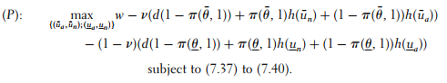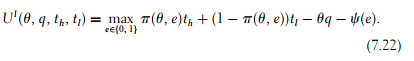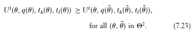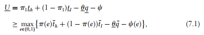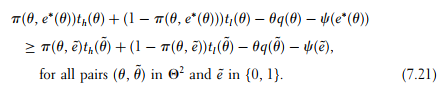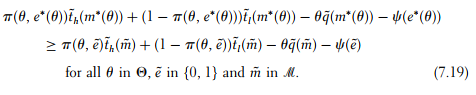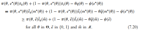 Remark: As for (7.1) and (7.3), the complexity of the latter two incen- tive constraints already shows some of the technical difficulties faced by the economist in modelling mixed environments. Indeed, when he considers deviating along the adverse selection dimension and not telling the truth to the principal anymore, the agent may also choose to change his supply of effort. Even if inducing a high effort is optimal for the principal when both types tell the truth, it is not necessary for the mechanism to require an agent to continue to exert this high effort if the agent lies about his type. Even in this simple environment, the right-hand sides of (7.31) and (7.32) are hard to describe, because the values of these maximands depend on how an agent with a given risk type changes his effort supply when he chooses different insurance contracts.