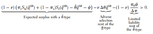 Simplifying, we find that the inefficient agent produces as long as the expected surplus he generates is greater than the sum of the adverse selection rent left to an efficient type and the limited liability rent left to the inefficient type. This condition is written as