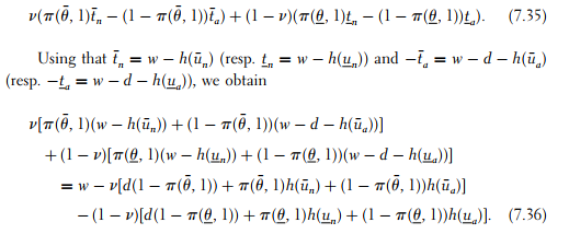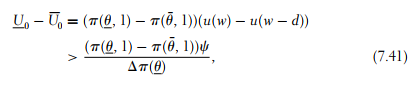 This condition ensures that the moral hazard incentive constraint for a high- risk type (7.29) is easier to satisfy than the one associated with a low-risk type (7.30). In this case, inducing effort from the low-risk agent requires a wedge between u(w − tn) and u(w − d + ta) that is large enough to ensure that a high-risk agent also prefers to exert a high effort, even when he lies and mimics a low-risk agent. Indeed, we have