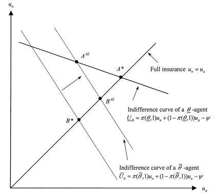 represents exactly the marginal cost of decreasing the risk borne by the low-risk agent under pure adverse selection. Hence, the random- ness in the high-risk agent’s payoff, which is implied by moral hazard, makes the insurance company less eager to decrease the risk borne by the low-risk agent even more than under pure adverse selection. Point ASB lies on the north-west of AAS on the indifference curve of the low-risk agent that corresponds to his expected utility without any insurance U0.