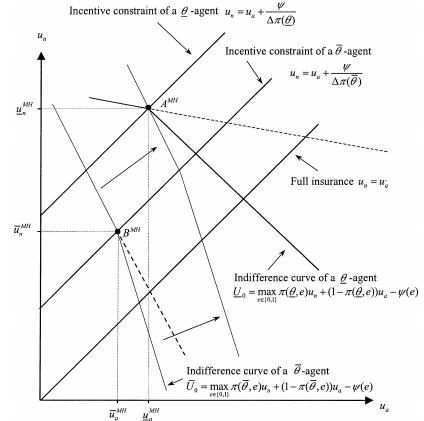 Let us finally consider the more complex case entailing both moral hazard and adverse selection. Graphically, we see that the menu of contracts (AMH, BMH) is no longer incentive compatible. Following the logic of the case with pure adverse selection, the high-risk agent also would like to choose contract AMH in order to increase his expected utility. The new level of utility that can be achieved by doing so is obtained by moving up the indifference curve of a θ¯-agent in a northeast direction until it reaches point AMH.