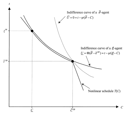 Interestingly, it is worthwhile to recast these results in terms of the progressive-ness or lack of progressiveness of the tax schedule. Indeed, as in the procurement model above, let us think of this optimal allocation as being implemented by a nonlinear income tax {τ(q)}. When he faces this nonlinear tax, the high- (resp. low-) productivity agent will choose to exert the second best level of efforts e¯SB and eSB, such that