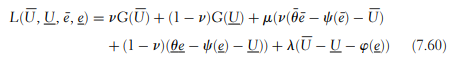 We let the reader check that the relevant incentive constraint is, as usual, that of the most productive type θ¯. Denoting the multiplier of the budget constraint (7.59) by µ and the multiplier of the incentive constraint (7.57) by λ, we can write the Lagrangian of the problem as