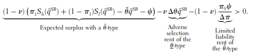 Simplifying, we find that the inefficient agent produces as long as the expected surplus he generates is greater than the sum of the adverse selection rent left to an efficient type and the limited liability rent left to the inefficient type. This condition is written as