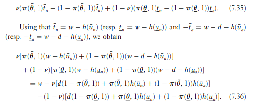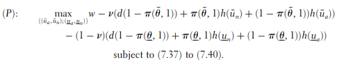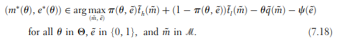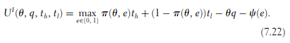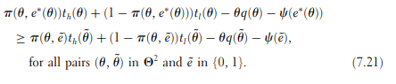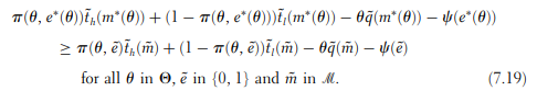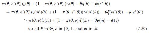 Remark: As for (7.1) and (7.3), the complexity of the latter two incen- tive constraints already shows some of the technical difficulties faced by the economist in modelling mixed environments. Indeed, when he considers deviating along the adverse selection dimension and not telling the truth to the principal anymore, the agent may also choose to change his supply of effort. Even if inducing a high effort is optimal for the principal when both types tell the truth, it is not necessary for the mechanism to require an agent to continue to exert this high effort if the agent lies about his type. Even in this simple environment, the right-hand sides of (7.31) and (7.32) are hard to describe, because the values of these maximands depend on how an agent with a given risk type changes his effort supply when he chooses different insurance contracts.