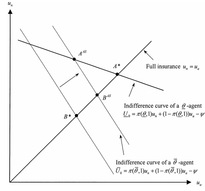 represents exactly the marginal cost of decreasing the risk borne by the low-risk agent under pure adverse selection. Hence, the random- ness in the high-risk agent’s payoff, which is implied by moral hazard, makes the insurance company less eager to decrease the risk borne by the low-risk agent even more than under pure adverse selection. Point ASB lies on the north-west of AAS on the indifference curve of the low-risk agent that corresponds to his expected utility without any insurance U0.