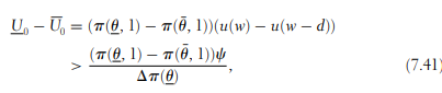 where Δπ(θ) = π(θ, 1) — π(θ, 0). This assumption simply means that both types are willing to exert a positive effort in the absence of any insurance contract. In this case, the right-hand sides of (7.26) and (7.27) are respectively given by