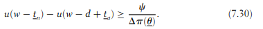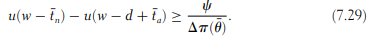 This condition ensures that the moral hazard incentive constraint for a high- risk type (7.29) is easier to satisfy than the one associated with a low-risk type (7.30). In this case, inducing effort from the low-risk agent requires a wedge between