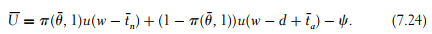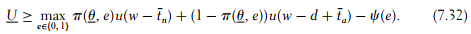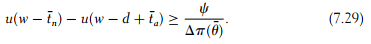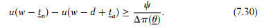 This condition ensures that the moral hazard incentive constraint for a high- risk type (7.29) is easier to satisfy than the one associated with a low-risk type (7.30). In this case, inducing effort from the low-risk agent requires a wedge between u(w − tn) and u(w − d + ta) that is large enough to ensure that a high-risk agent also prefers to exert a high effort, even when he lies and mimics a low-risk agent. Indeed, we have