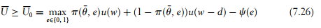 Optimizing with respect to the cost targets C and C¯ amounts to optimizing with respect to the effort levels e and e¯, which are indirectly requested from, respectively, an efficient type and an inefficient type once one has recognized that those cost targets and efforts are linked by the relationships C = θ − e and C¯ = θ¯ − e¯. Expressing the principal’s objective function in terms of efforts and taking into account that (7.51) and (7.54) are both binding at the optimum, the principal’s problem becomes