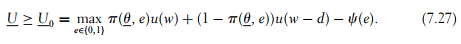 Remark: As for (7.1) and (7.3), the complexity of the latter two incen- tive constraints already shows some of the technical difficulties faced by the economist in modelling mixed environments. Indeed, when he considers deviating along the adverse selection dimension and not telling the truth to the principal anymore, the agent may also choose to change his supply of effort. Even if inducing a high effort is optimal for the principal when both types tell the truth, it is not necessary for the mechanism to require an agent to continue to exert this high effort if the agent lies about his type. Even in this simple environment, the right-hand sides of (7.31) and (7.32) are hard to describe, because the values of these maximands depend on how an agent with a given risk type changes his effort supply when he chooses different insurance contracts.