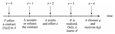 Through the contract he offers to the agent, the principal wants to control both the agent’s effort and the agent’s incentives to tell the truth on the state of nature that is realized ex post. The timing of contracting is described in figure 7.6.