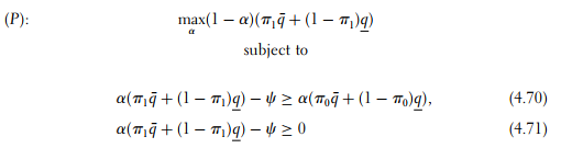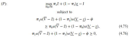 where (4.75) and (4.76) are respectively the agent’s incentive and participation constraints. Note that the project is a valuable venture if it provides the bank with a positive expected profit.