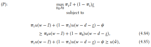The insurance market is often viewed as an archetypical example of a perfectly competitive market where insurers’ profits are driven to zero. Without entering too much into the difficult issues of competitive markets plagued by agency problems, it is nevertheless useful to characterize the equilibrium contract inducing a positive effort. Because of perfect competition among insurance companies, this contract should maximize the agent’s expected utility subject to the standard incentive compatibility constraint (written with our usual change of variables)