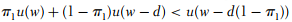 Moral hazard also undermines the functioning of insurance markets. We consider now a risk-averse agent with utility function uk·l and initial wealth w. With prob- ability π(e) (resp. 1 − π(e)) the agent has no (resp. an) accident and pays an amount z¯ (resp. z) to an insurance company. The damage incurred by the agent is worth d. Effort e in {0, 1} can now be interpreted as a level of safety care.