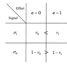 Note that the signal σ1 (resp. σ0) is good news (resp. bad news), that the agent has exerted a high level of effort. The signal is uninformative on the agent’s effort when ν0 = ν1.