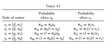The framework of section 4.5, with multiple levels of performance, is extremely useful when assessing the principal’s benefit from sources of information other than the agent’s sole performance. To assess the role of improved information structures, let us still assume that there are only two levels of production q¯ and q, and that the principal also learns a binary signal σ˜ belonging to the set ∑ = {σ0, σ1}, which depends directly on the agent’s effort. More precisely, the matrix in figure 4.5 gives the probabilities of each signal σi for i in {0,1} as a function of the agent’s effort.