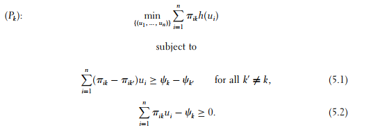 Let us thus denote by (Pk) the cost minimization problem of a principal willing to implement effort ek. Using our by now standard change of variables, the important variables are the utility levels in each state of nature, i.e., ui = u(ti) or alternatively ti = h(ui) where h = u−1 is increasing and convex (h‘ > 0 and h” > 0). (Pk) is now a convex problem that is written as: