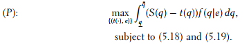 We denote by {(tSB(·), eSB)} the solution to (P). The first difficulty with this problem is to ensure that such an optimum exists within the class of all admissible functions t(·). For instance, Mirrlees (1999) has shown that the problem may sometimes have no optimal solution in the class of unbounded sharing rules. The difficulty here comes from the lack of compacity of the set of incentive feasible contracts.6 We leave aside these technicalities to focus on what we think is the main difficulty of problem (P)—simplifying the infinite number of global incentive constraints in (5.18) and replacing those constraints by the simpler local incentive constraint: