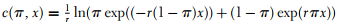 Let us also assume that the agent has a constant risk aversion, namely the constant absolute risk aversion (CARA) utility function u(x) = − exp(−rx). When facing a binary lottery yielding wealths a and b with respective probabilities π and 1 − π, this agent obtains a certainty equivalent of income, which is defined as