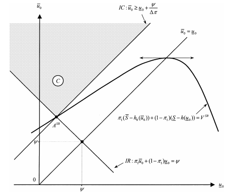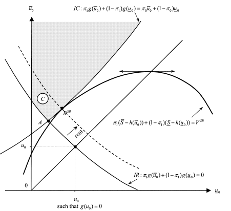 Similarly, the binding participation constraint (5.79) also defines a convex locus. The set C of incentive feasible contracts is again strictly convex, with an extremal point A still obtained when both constraints are binding. However, the strict convexity of C now leaves some scope for the optimal contract to be at point BSB, where only the incentive constraint is binding. In this case, the best way to solve the incentive problem is to give up a strictly positive ex ante rent to the agent. This case is more likely to take place when the IC constraint defines a very convex curve, i.e., when gf·g is very concave. This occurs when the agent is much more risk averse when he exerts a positive effort than when he does not. In this case, offering a risky lottery to induce effort and keep the agent’s expected utility relatively low is costly for the principal. The principal prefers to raise the agent’s expected utility to move toward areas where a risky lottery is much less costly.