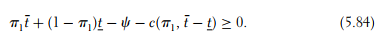 It is important to note that these constraints depend in a separable way on, first, the average transfer (π1t¯ + (1 − π1(t) received by the agent and, second, the risk created by these transfers (t¯ − t). More precisely, the principal can ensure that the participation constraint (5.84) is binding by reducing the agent’s average transfer without perturbing the power of the incentive contract, i.e., still keeping the incentive constraint (5.83) satisfied. Indeed, this latter constraint can also be written as