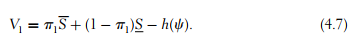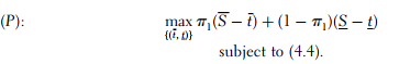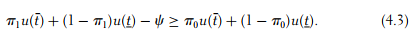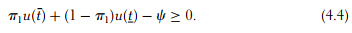 (4.3) is the incentive constraint that imposes upon the agent to prefer to exert a positive effort. If he exerts effort, the agent faces the lottery that gives t¯ (resp. t) with probability π1 (resp. 1 − π1) and not the lottery that yields t¯ (resp. t) with probability π0 (resp. 1 − π0). However, when he does not exert effort, the agent incurs no disutility of effort and saves an amount ψ.