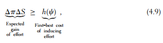 The left-hand side of (4.9) captures the gain of increasing effort from e = 0 to e = 1. This gain comes from the fact that the return S¯, which is greater than S, arises more often when a positive effort is exerted. The right-hand side of (4.9) is instead the first-best cost of inducing the agent’s acceptance when he exerts a positive effort.