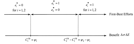 Let us turn now to the characterization of the optimal effort chosen by the principal in this second-best environment. To better understand these choices it is useful to start with the simple case where tasks are technologically unrelated, i.e.,ψ2 = 2ψ1. Suppose that the principal wants to induce effort on only one task. Under complete information, the expected incremental benefit of doing so, ΔπΔS, should exceed the first-best cost C1FB of implementing this effort: