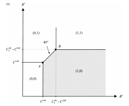 . The principal prefers to induce e1 = e2 = 1, rather than e1 = e2 = 0, when B1 + B2 − C2SB ≥ 0. The principal also prefers to induce e1 = e2 = 1 rather than e1 = 1 and e2 = 0 when B1 + B2 − C2SB ≥ B1 − C1SB. Similarly, e1 = e2 = 1 is preferred to e1 = 0 and e2 = 1 when B1 + B2 − C2SB ≥ B2 − C2SB.