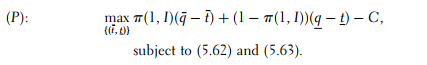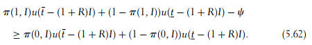 The first inequality uses t¯ > t, and the fact that uf·g is concave. The equality uses the fact that (5.62) is binding if the effort is induced at minimal cost. Finally, the second inequality uses the assumption (5.66). Therefore, (5.64) is more stringent than (5.65). (5.64) may be the more constraining of the incentive constraints when both investment and effort are nonobservable. In this case, the contract offered when I˜ is contractible, namely