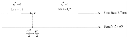 . The more stringent constraint on the right-hand side of (5.31) is obtained when the principal lets the agent exert one positive level of effort.14 Figure 5.2 summarizes the first-best choices of effort made by the principal as a function of the incremental benefit ΔπΔS associated with each task.