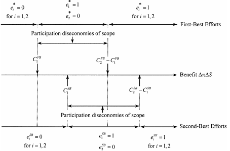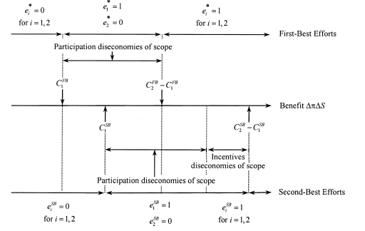 means that it is less often valuable for the principal to induce both efforts rather than inducing one effort when effort is verifiable. The latter inequality also means that the first-best cost of implement- ing efforts exhibits some diseconomies of scope. Adding up tasks makes it more costly to induce effort from the agent, even if those tasks are technologically unre- lated and contracting takes place under complete information. The point here is that inducing the agent to exert more tasks requires increasing the certainty equivalent income necessary to satisfy his participation constraint. Adding more tasks therefore changes the cost borne by the principal for implementing an extra level of effort. Now that the agent has a decreasing marginal utility of consump- tion, multiplying the level of effort by two requires multiplying the transfer needed to ensure the agent’s participation by more than two. For that reason, the disec- onomies of scope isolated above can be viewed as pure participation diseconomies of scope.
