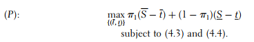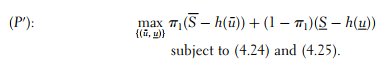 It is not obvious that (P) is a concave program for which the first-order Kuhn and Tucker conditions are necessary and sufficient. The reason for this possible lack of concavity is that the concave function u(·) appears on both sides of the incentive compatibility constraint (4.3). However, the following change of variables shows that concavity of the program is ensured. Let us define u¯ = u(t¯) and u = u(t), or equivalently let t¯ = h(u¯) and t = h(u). These new variables are the levels of ex post utility obtained by the agent in both states of nature. The set of incentive feasible contracts can now be described by two linear constraints: