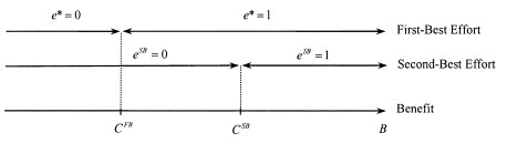 For B belonging to the interval [CFB, CSB], the second-best level of effort is zero and is thus strictly below its first-best value. There is now an under-provision of effort because of moral hazard and risk aversion.