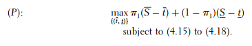 A first observation is that the transfers (4.12) and (4.13), allowing the imple- mentation of the first-best, may not satisfy the newly added limited liability con- straints. Proposition 4.2 summarizes the solution to (P).