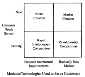 The Matrix in Figure 9-10 offers a useful way of analyzing the types of disruption that can be pursued by a hypercompetitive firm. It is based on selecting new or existing markets to serve and new or existing methods for serving them, as shown in Figure 9-10. By identifying which of the four squares to compete in, the company defines its next move or series of moves. Companies can jump from disruptions in one quadrant to disruptions in others, as demonstrated by the beer industry example below.