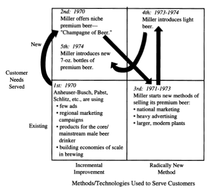 For example, the competition in the “beer wars” between Miller and Anheuser-Busch illustrates how different visions for disruption might be created through the use of the Matrix in Figure 9-10. Miller used an understanding of the customer and strategic soothsaying to shift from one quadrant to the next. As shown in Figure 9-11, in 1970 most of the beer makers were serving the same customer without much change or improvement in their methods, other than through continuously increasing economies of scale in production. Miller disrupted the market by positioning its beer as the champagne of beers, creating a premium niche in the beer mar-ket. It then created new distribution channels and methods for selling this beer, using a national advertising campaign and other entirely new methods of serving the customer. Then Miller built on these methods to move into an entirely new market with a new brewing method when it introduced light beer and discovered that it could be positioned for women. It also moved again to serve existing customers through incremental improvements by introducing the new seven-ounce bottle. In this way Miller has disrupted the beer market by shifting its focus back and forth between existing and new customers and existing and new methods. Each new disruption was designed to seize the initiative for Miller. The sequencing was designed to maintain the momentum for Miller. (Figure 9-11 illustrates these shifts.) Unfortunately Miller lost the initiative to Anheuser-Busch, which counterattacked with many disruptions that were executed better than those used by Miller Beer. Anheuser-Busch, in particular, was gaining share due to a series of modest plant modernizations and new brewing techniques designed to serve the male beer drinker.