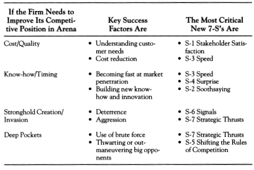 Moreover, firms have limited resources, so they can’t acquire all seven of the New S’s at once. They must prioritize them and make tradeoffs. Thus, it will be rare that a firm is equally good at all of the New 7-S’s. This will create opportunities for a new type of hypercompetitive behavior whereby firms use the resource investments tradeoff made by a competitor to determine which of the New 7-S’s should be invested in first. Finally, truly hypercompetitive firms, like Intel, will find ways to eliminate the tradeoffs. Tradeoffs exist only if firms believe that tradeoffs are necessities and stop looking for ways to do both alternatives. After all, it was once said that firms could not achieve low cost and high quality at the same time. Now it is not just a reality but a necessity for survival in many industries.